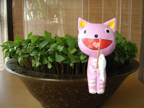 這盆是女兒上家政課的作業,主題是綠化家居之類的,老師給他們盆子、土和植物,每一組有一盆,在學校照顧一陣子後,這個主題的課程結束,女兒把它帶回家。